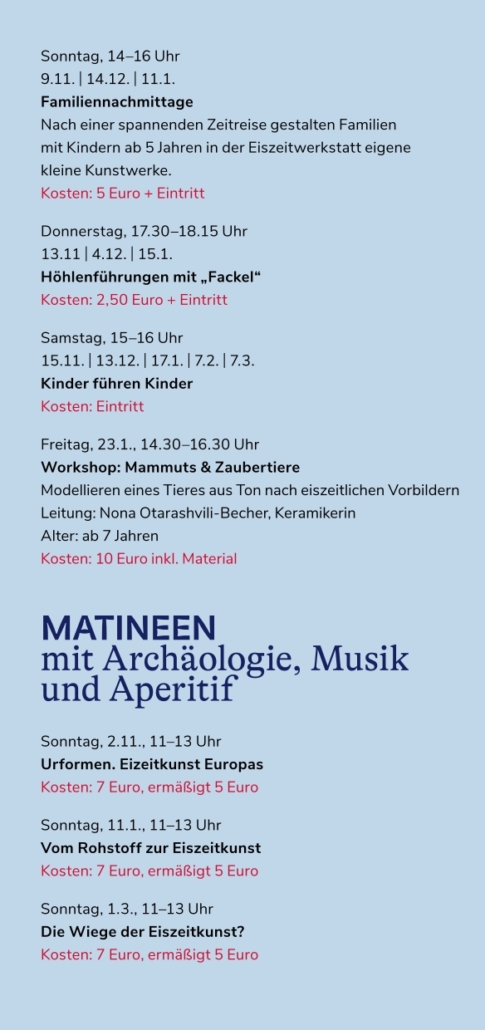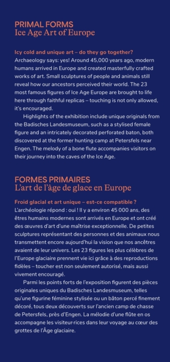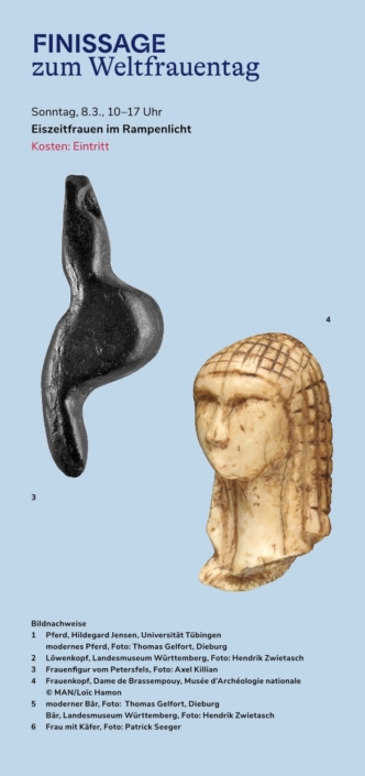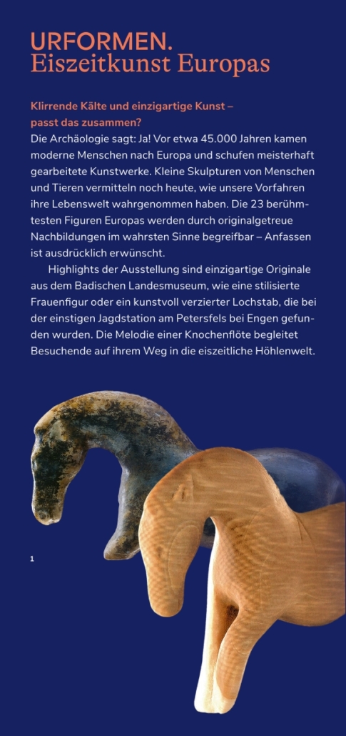 Highlights der Ausstellung sind einzigartige Originale aus dem Badischen Landesmuseum, wie eine stilisierte Frauenfigur oder ein kunstvoll verzierter Lochstab, die bei der einstigen Jagdstation am Petersfels bei Engen gefunden wurden. Die Melodie einer Knochenflöte begleitet Besuchende auf ihrem Weg in die eiszeitliche Höhlenwelt.
